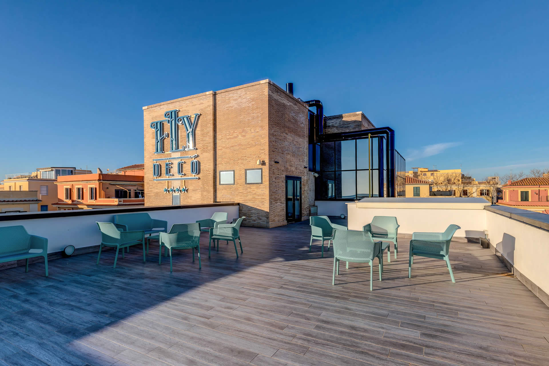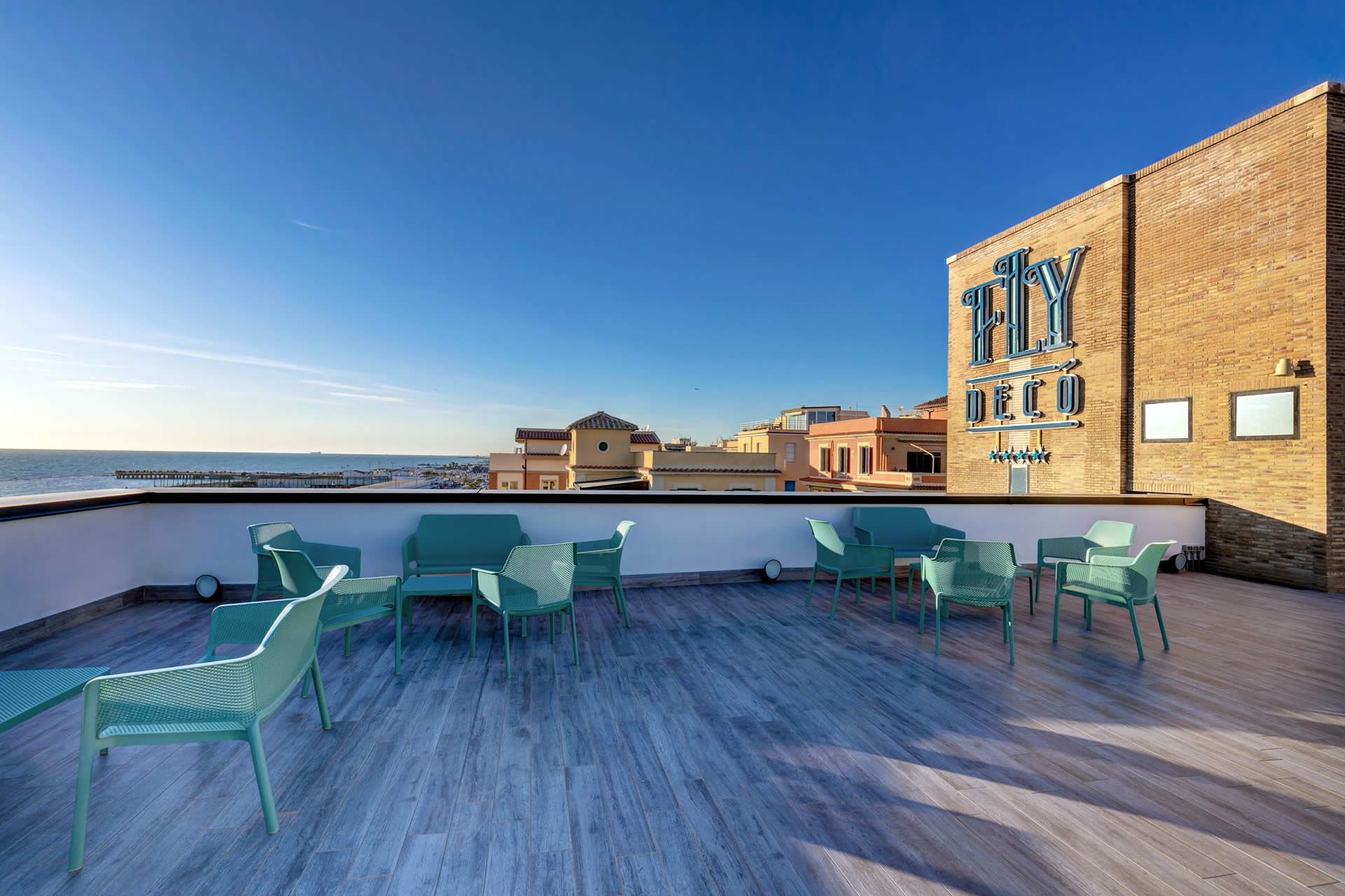 All'ultimo piano del Fly Decó Hotel di Ostia, si apre una terrazza panoramica che regala una vista incantevole sul mare e sulla costa romana.